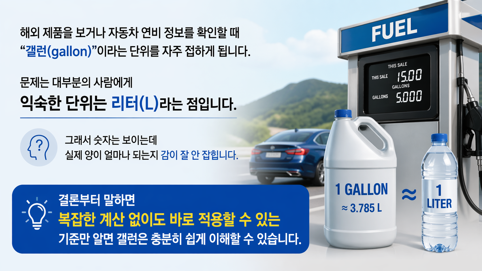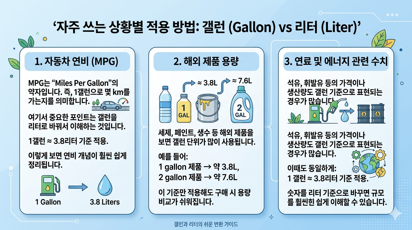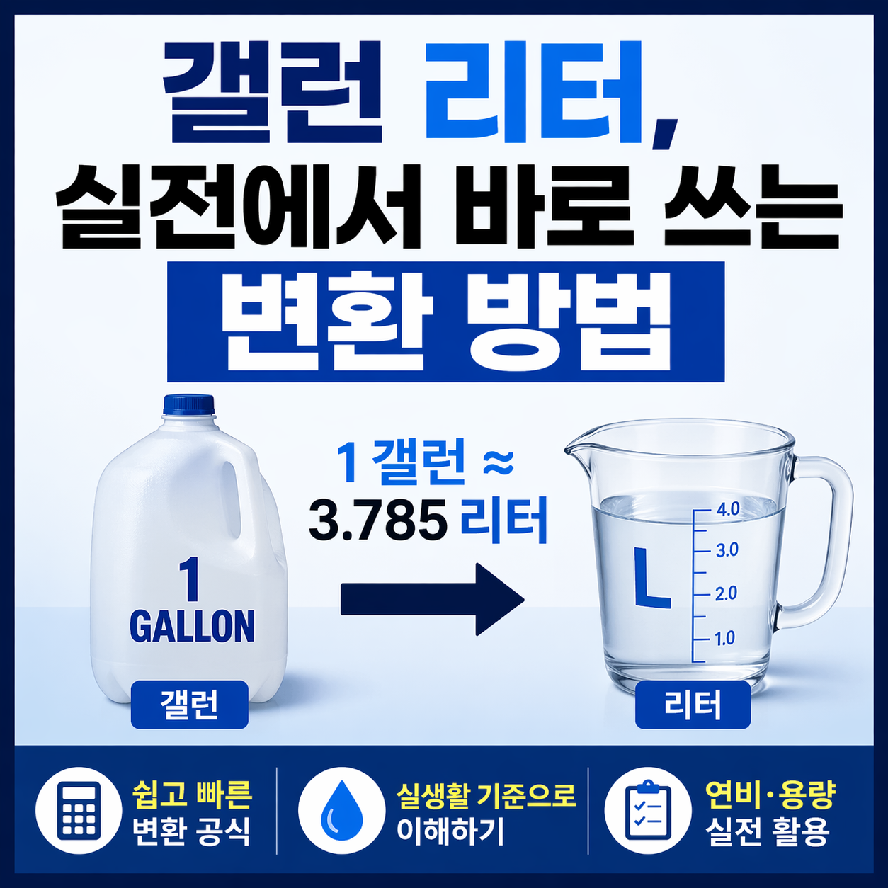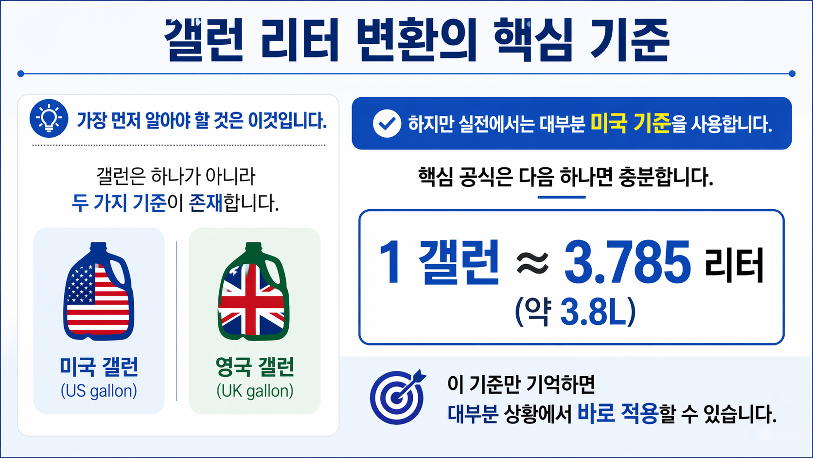 - 1 갤런 ≈ 3.785 리터 (약 3.8L)