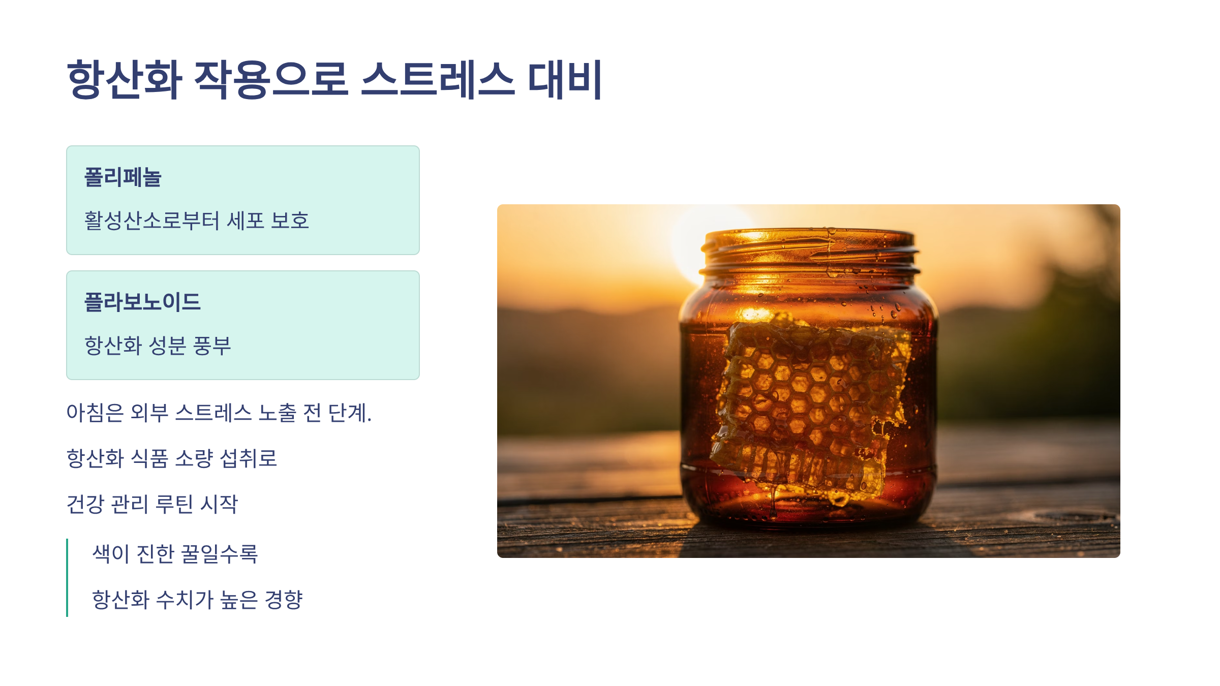 색이 진한 꿀일수록 항산화 수치가 높은 경향이 있다는 점도 참고할 만합니다.