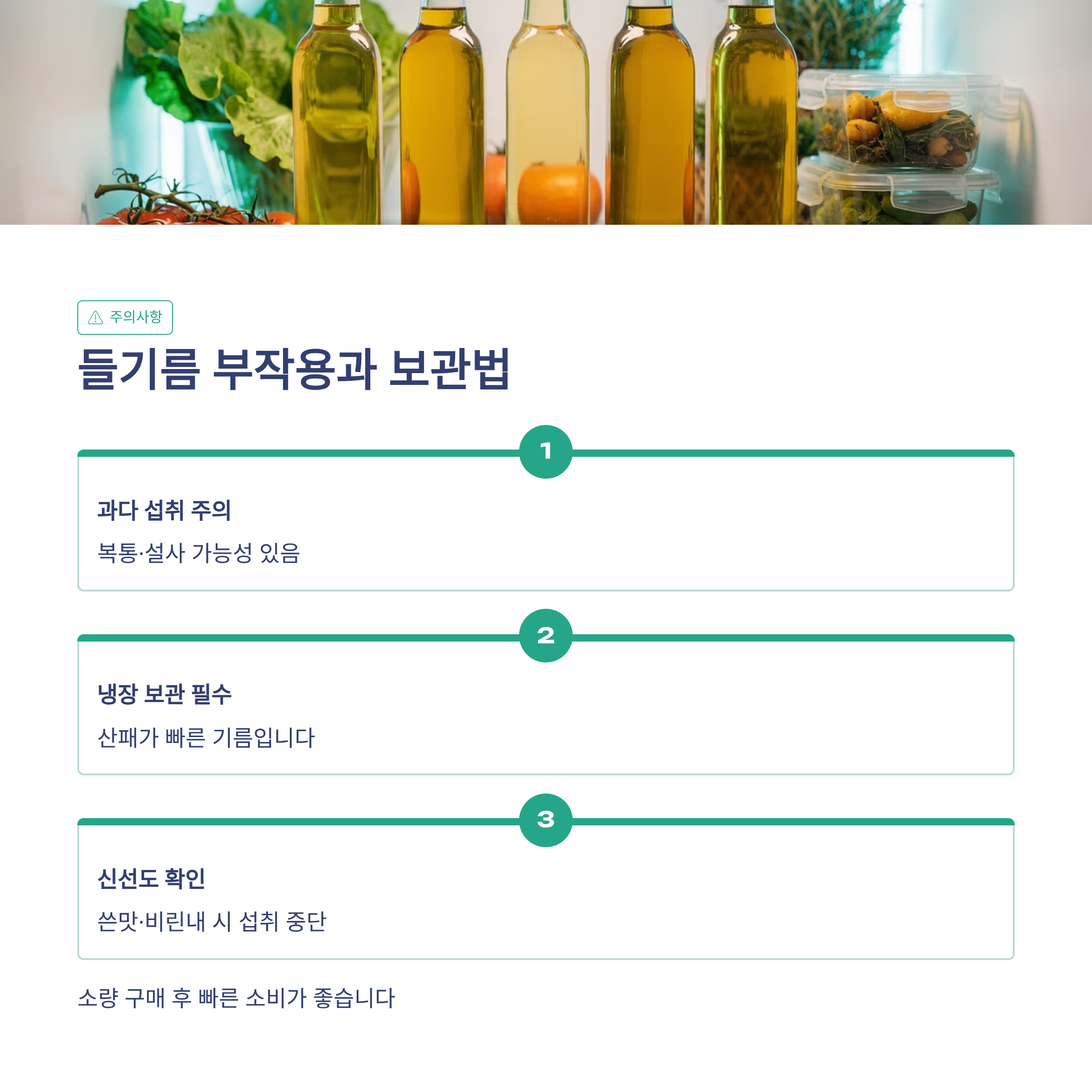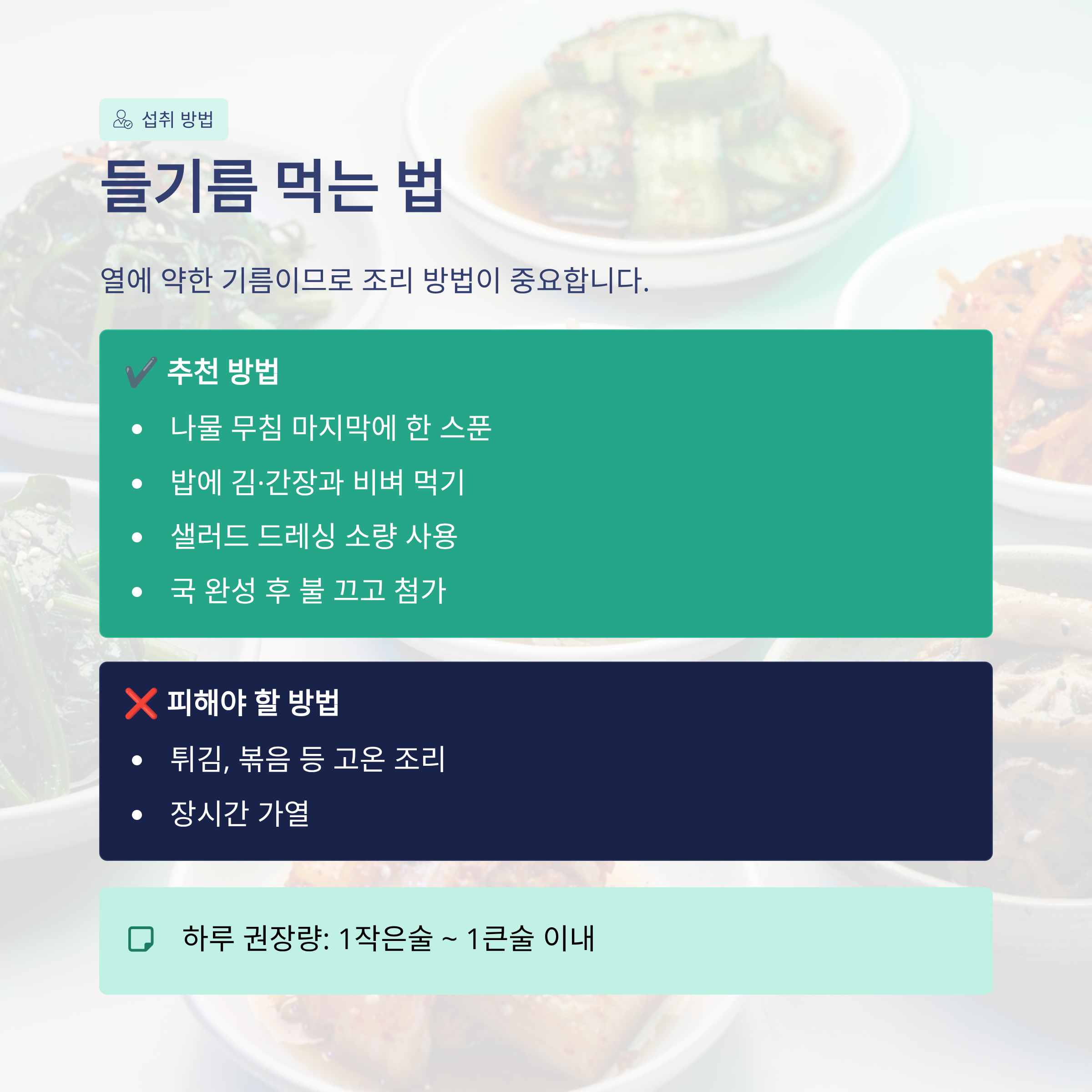 들기름 효능의 핵심은 ‘많이’가 아니라 ‘꾸준히, 올바르게’입니다.