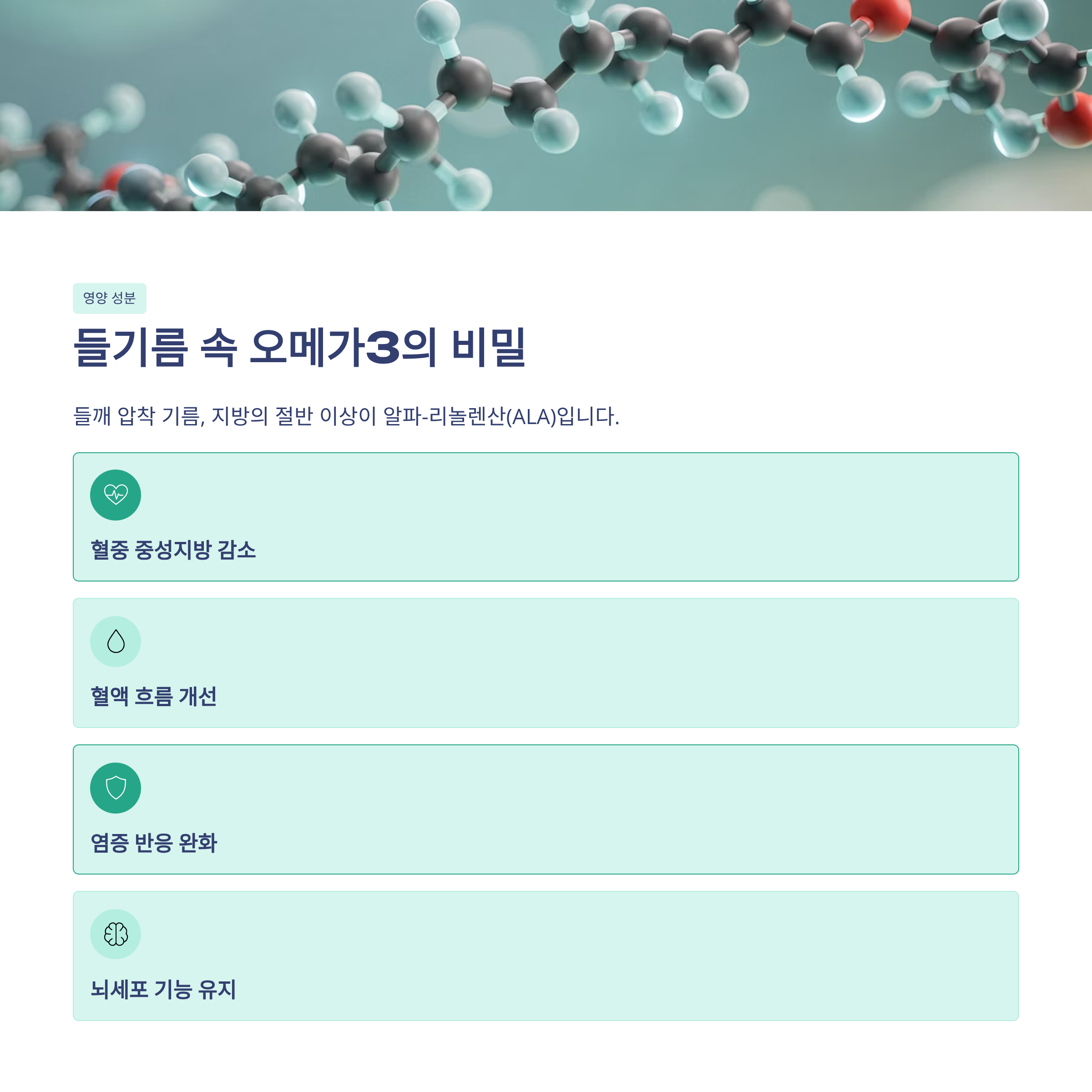 들기름은 식물성 오메가3 공급원으로 활용도가 높습니다.