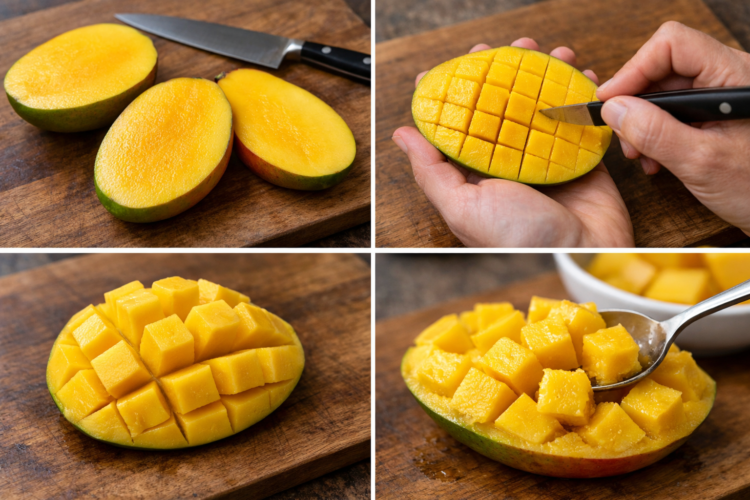 가장 널리 알려진 방법은 망고 과육에 격자 모양을 내는 방식입니다.