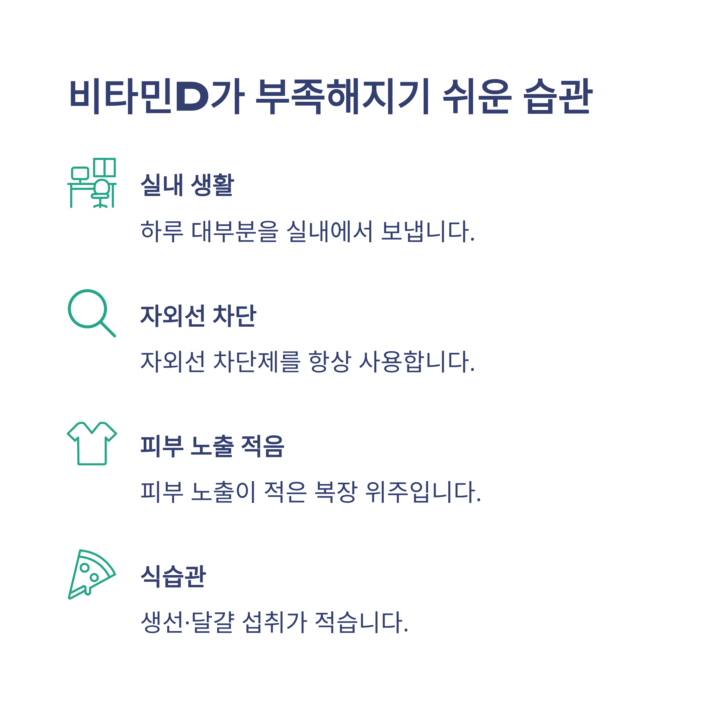 ✔ 햇빛 노출: 하루 15~20분 정도 팔·다리 노출