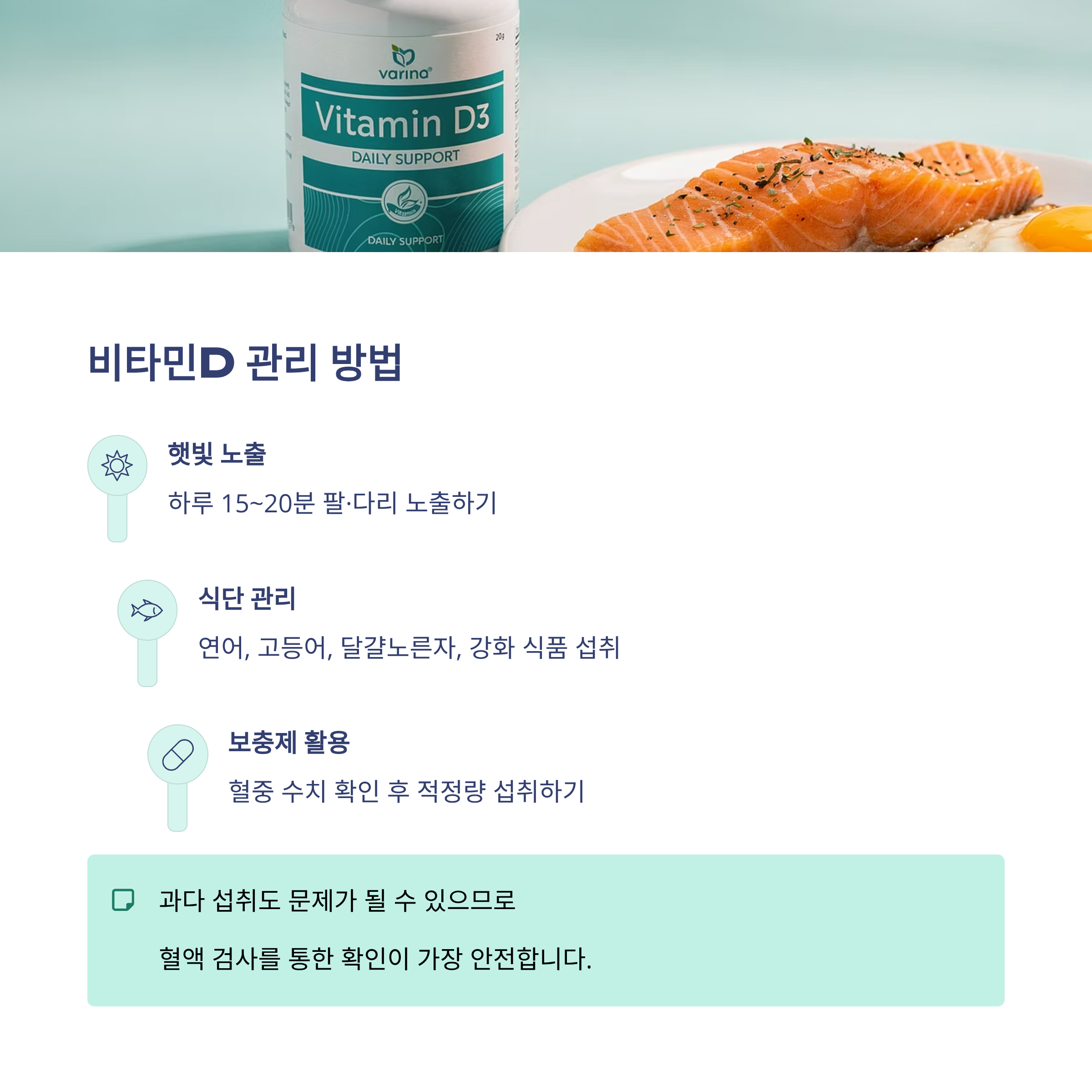 ✔ 식단 관리: 연어, 고등어, 달걀노른자, 비타민D 강화 식품