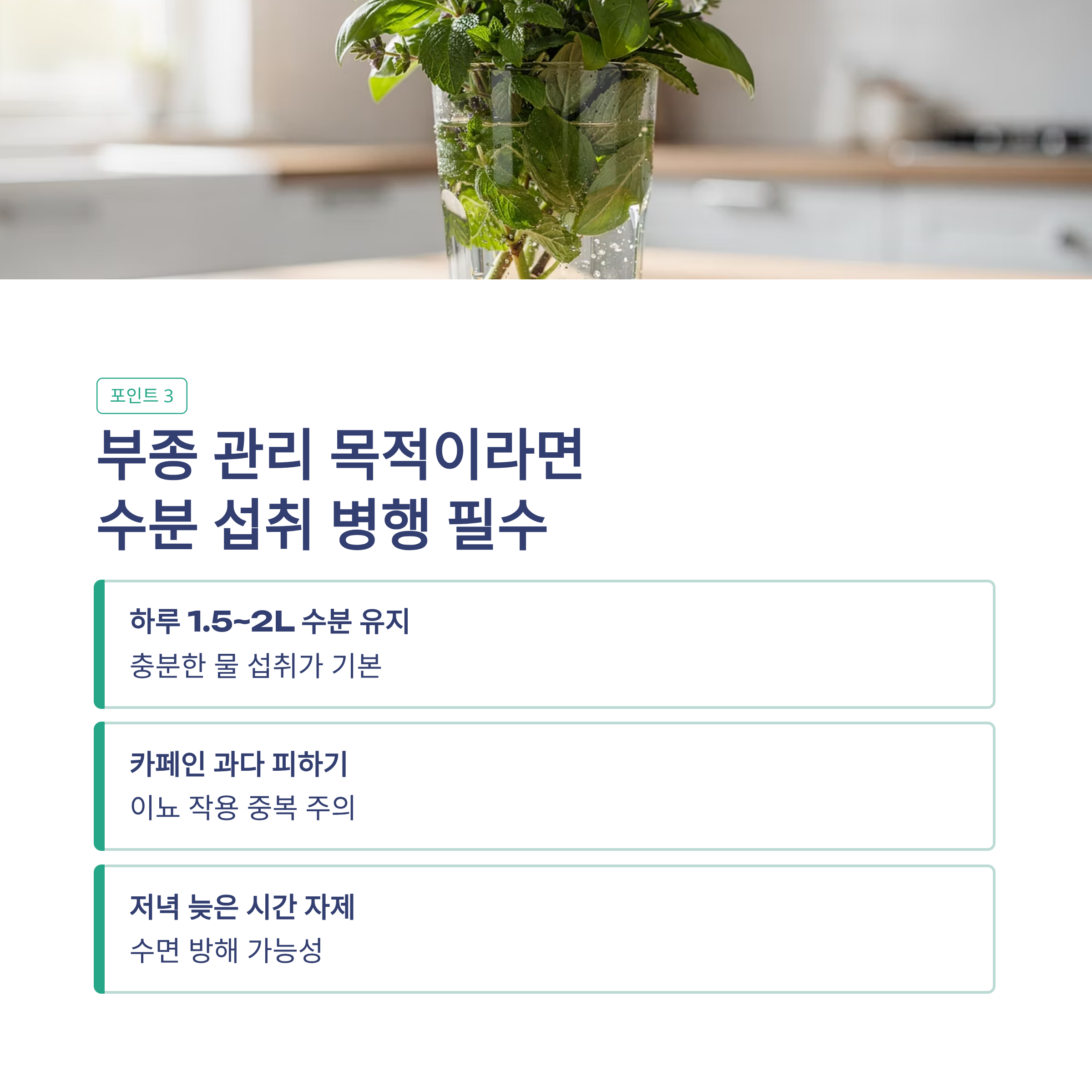 3️⃣ 부종 관리 목적이라면 수분 섭취를 병행
