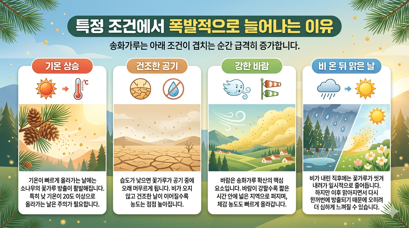 송화가루는 아래 조건이 겹치는 순간 급격히 증가합니다.