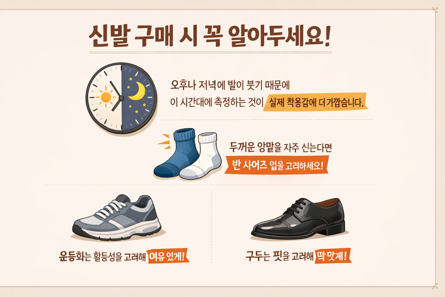 신발은 시간대에 따라 발 크기가 달라질 수 있습니다.
