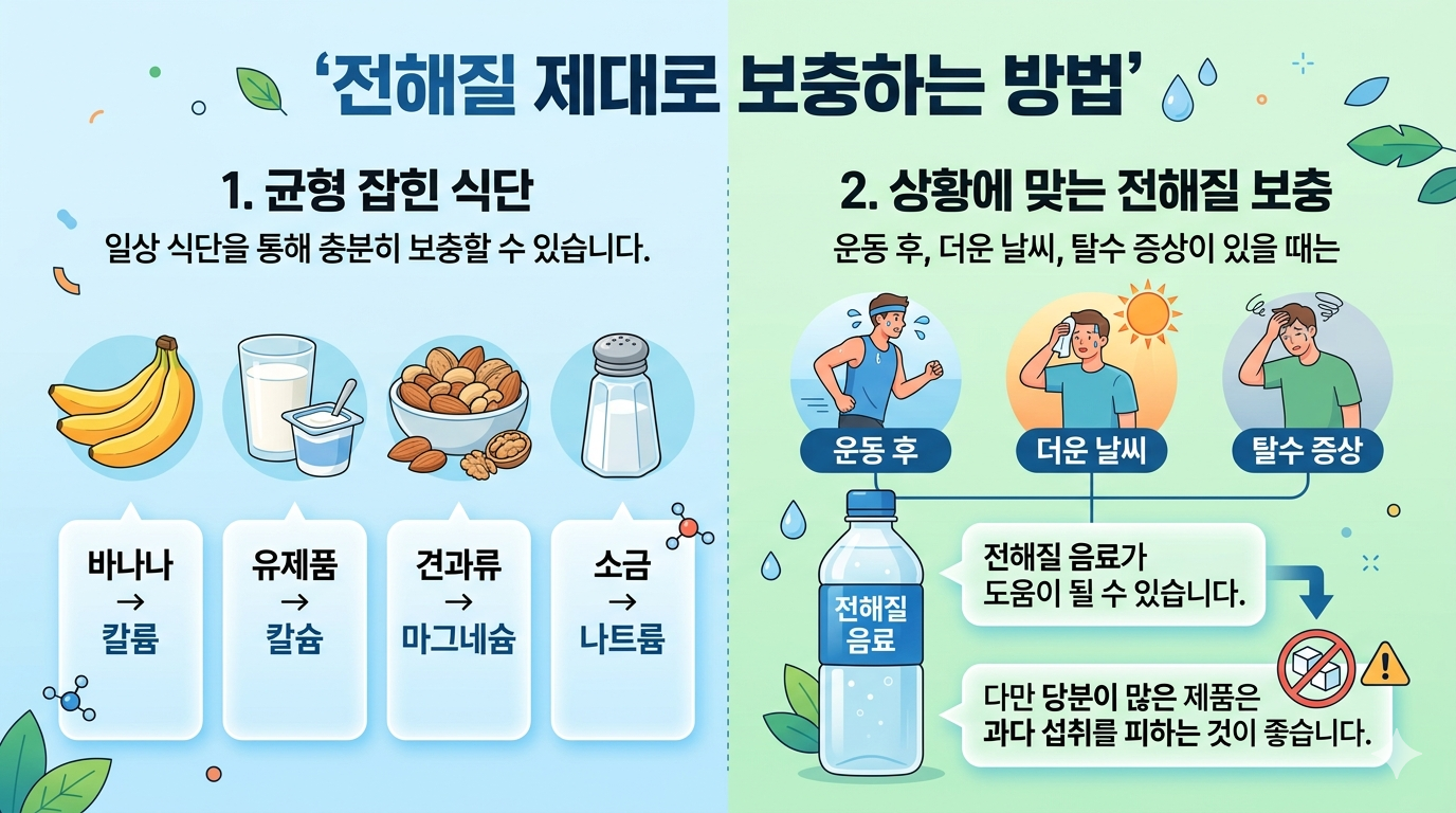 특히 운동, 더위, 탈수 상황에서는 전해질 관리가